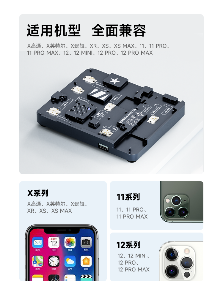 适用型号:X高通、X英特尔、X逻辑、XR、XS、XS Max、 11、11 Pro、11 Pro Max、 12、12 mini、12 Pro、12 Pro Max